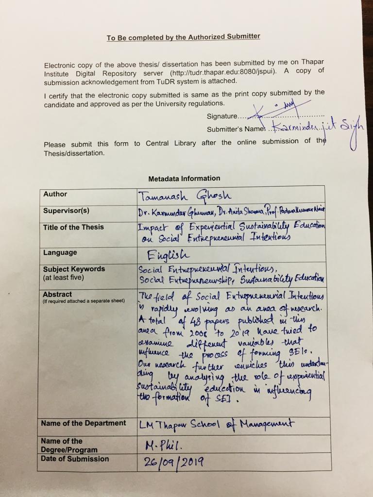 The field of social entrepreneurial intentions is rapidly evolving as an area of research. A total of 43 papers published in this area from 2008 to 2019 have tried to examine different variables that influence the process of forming SEIs. Our research further enriches this understanding by analysing the role of experiential sustainability education in influencing the formation of SEI.
