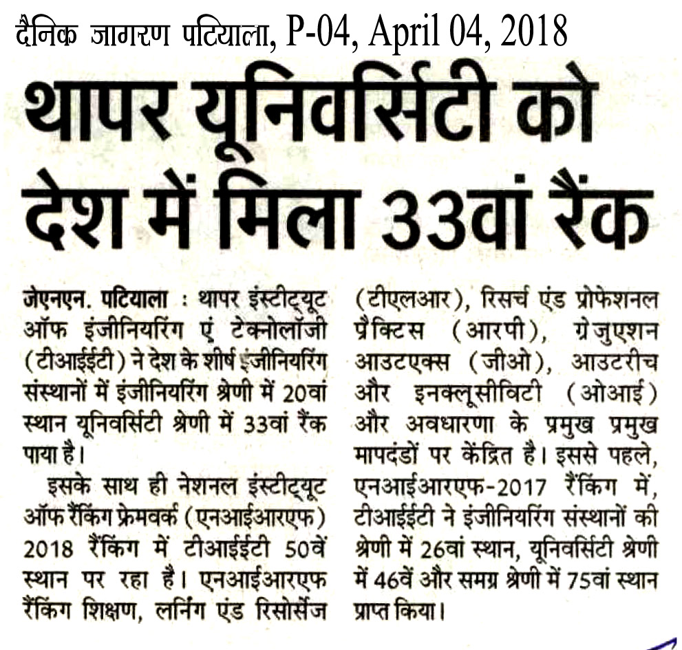 थापर यूनिवर्सिटी लो देश में मिला 33वां रैंक