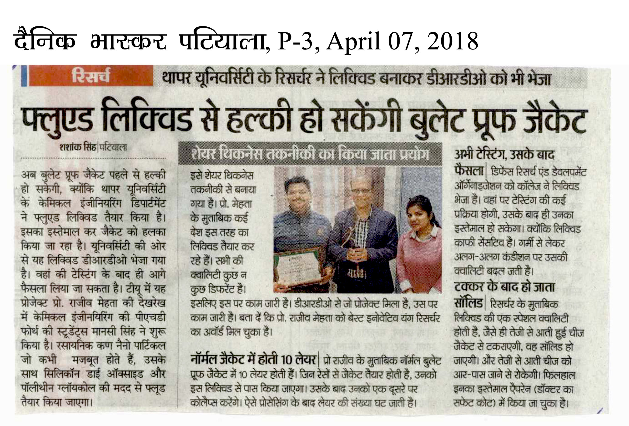 फ्लूएड लिक्विड से हल्की हो सकेंगी बुलेट प्रूफ जैकेट : थापर यूनिवर्सिटी के रिसर्चर ने बनाकर डीआरडीओ को भेजा