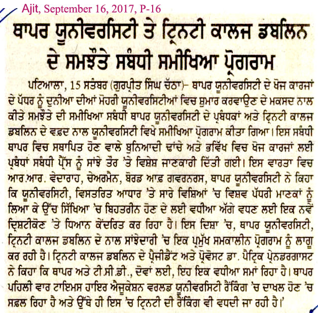 ਥਾਪਰ ਯੂਨੀਵਰਿਸਟੀ ਤੇ ਟ੍ਰਿਨਿਟੀ ਕਾਲਜ ਡਬ੍ਲਿਨ ਦੇ ਸਮਜੋਤਾ ਸਬੰਧੀ ਸਮੀਖਿਆ ਪ੍ਰੋਗਰਾਮ