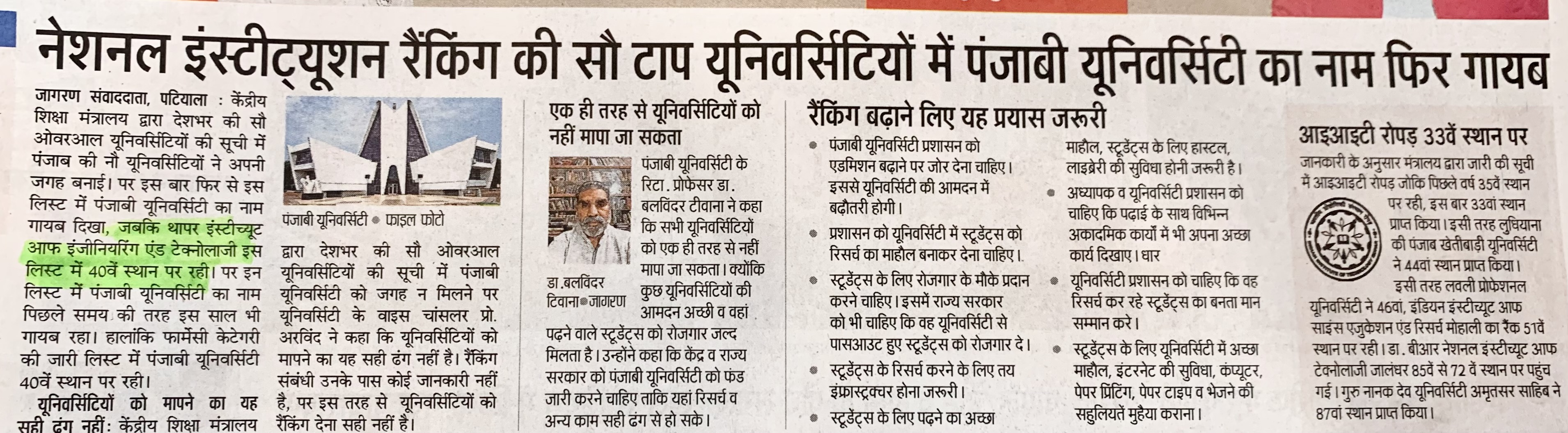 नेशनल इंस्टीट्यूशनल रैकिंग कि सो टॉप यूनिवर्सिटी माई पंजाबी यूनिवर्सिटी का नाम फिर गायब