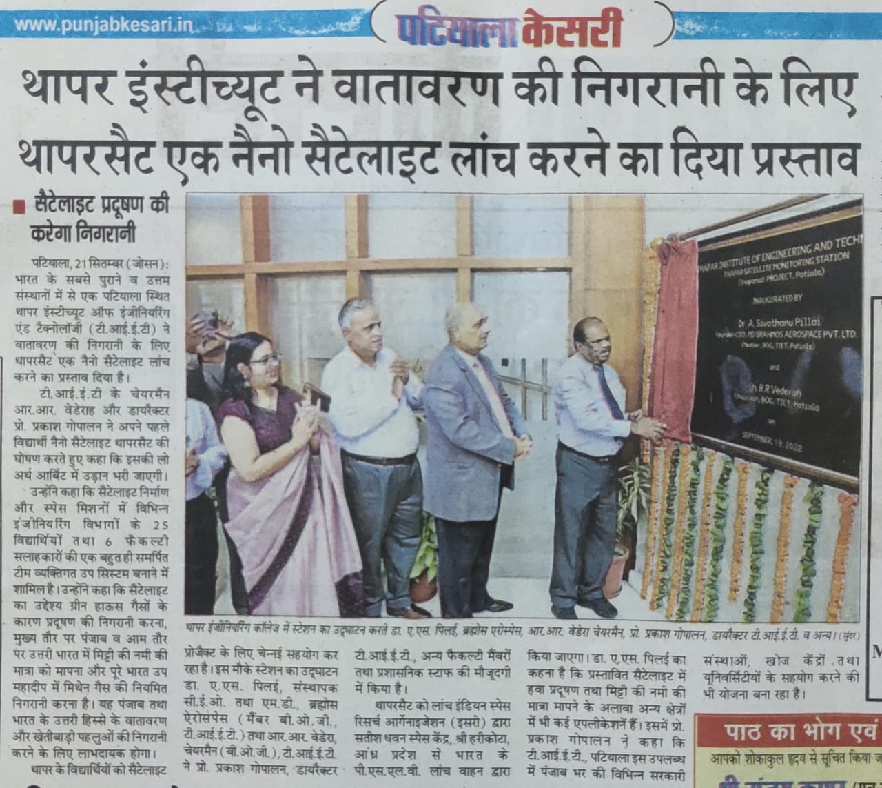 थापर इंस्टीट्यूट ने वातावरण की निगरानी के लिए थापरसैट लॉन्च करने का दिया प्रस्ताव