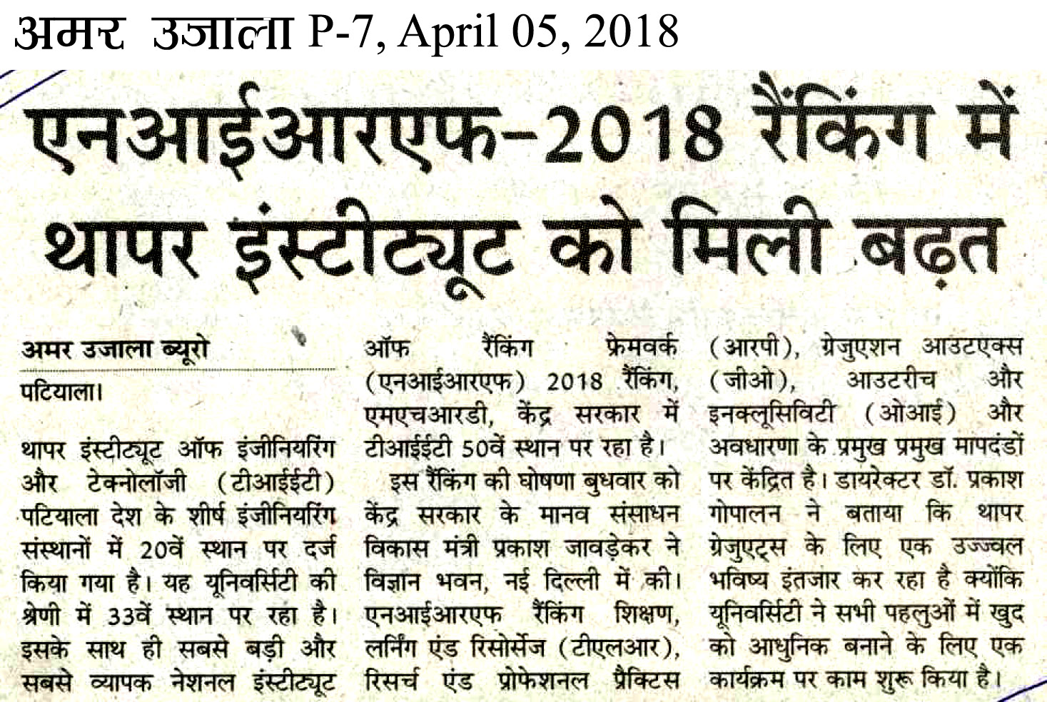 एनआईआरएफ- 2018 रैंकिंग में थापर इंस्टिट्यूट को मिली बढ़त