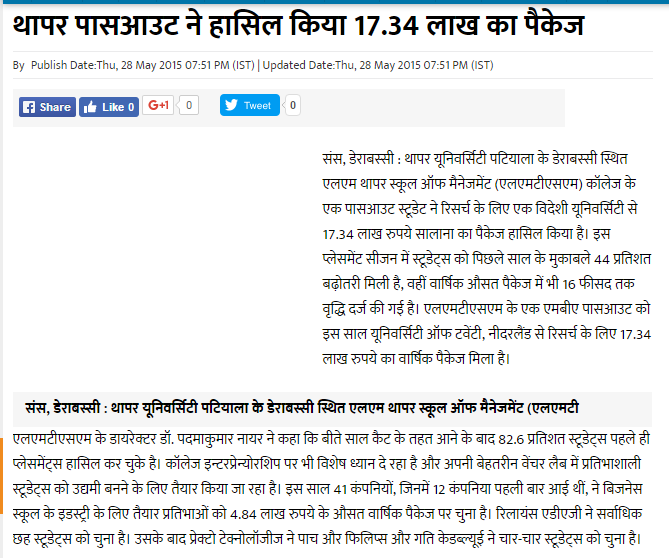 थापर पासआउट ने हासिल किया 17.34 लाख का पैकेज