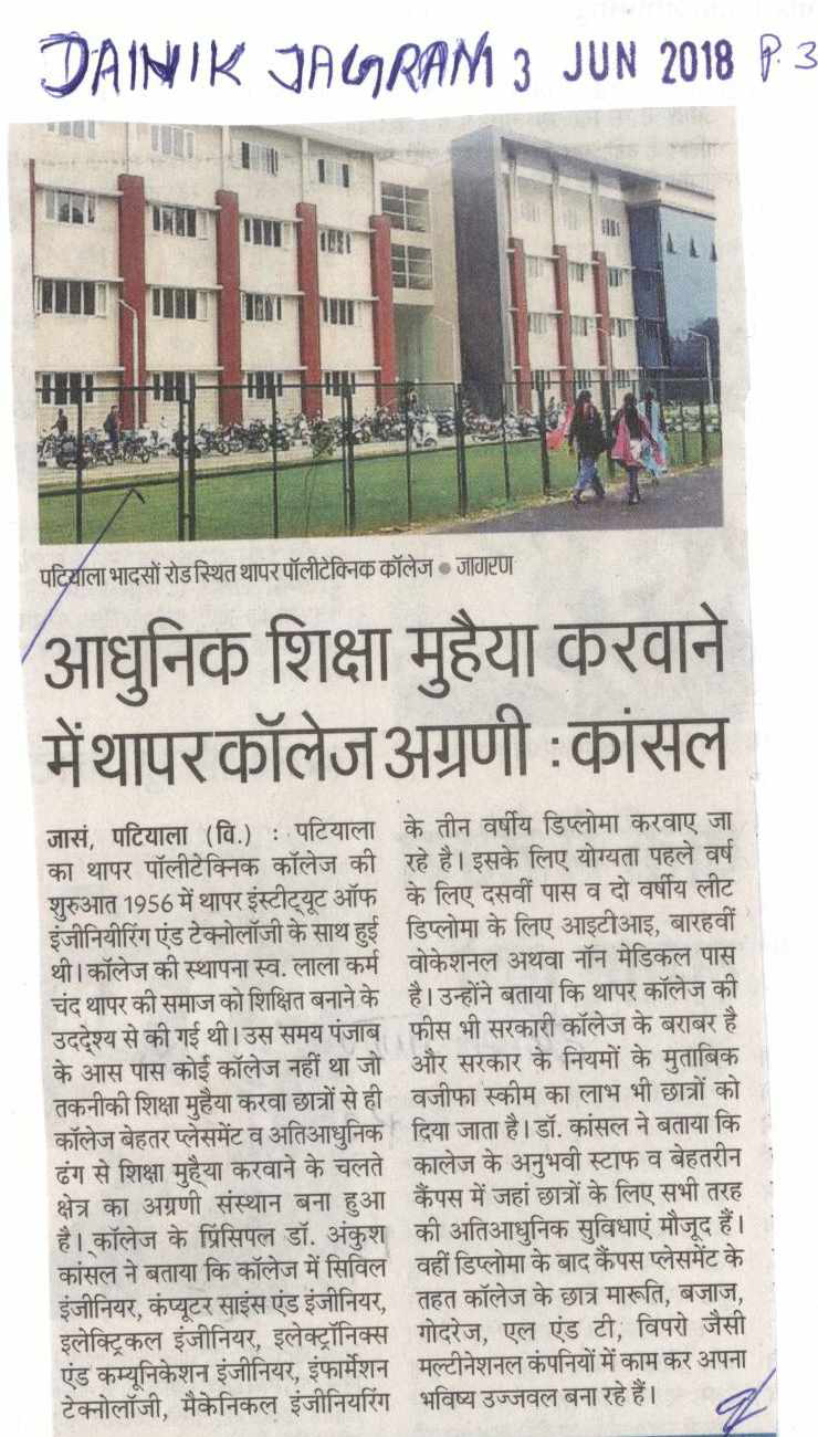 आधुनिक शिक्षा मुहैया करवाने में थापर कॉलेज अग्रणी : कांसल
