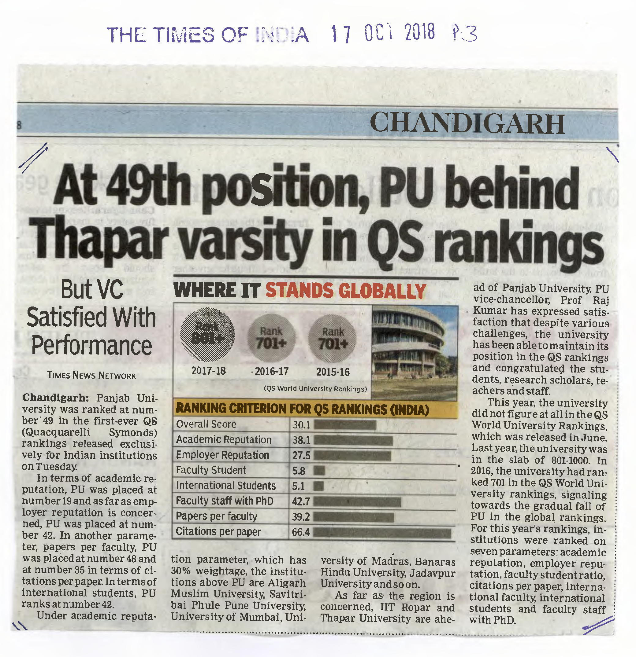 At 9th Position, PU Behind Thapar Varsity in QS Ranking