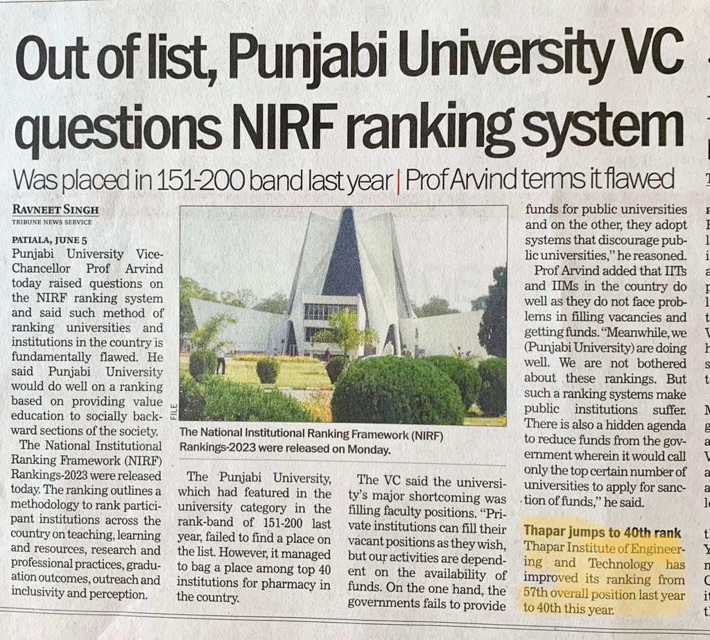 Thapar Institute of Engineering and Technology has improved its ranking from 57th overall position last year to 40th this year.